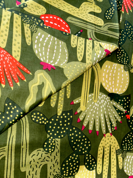 Green Pure Cotton Cambric Printed Fabrics, Colorful Cactus Print, Floral