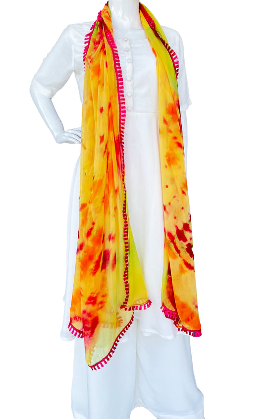 White Pure Muslin kurta Palazzo With Yellow Red Tie DyeDupatta