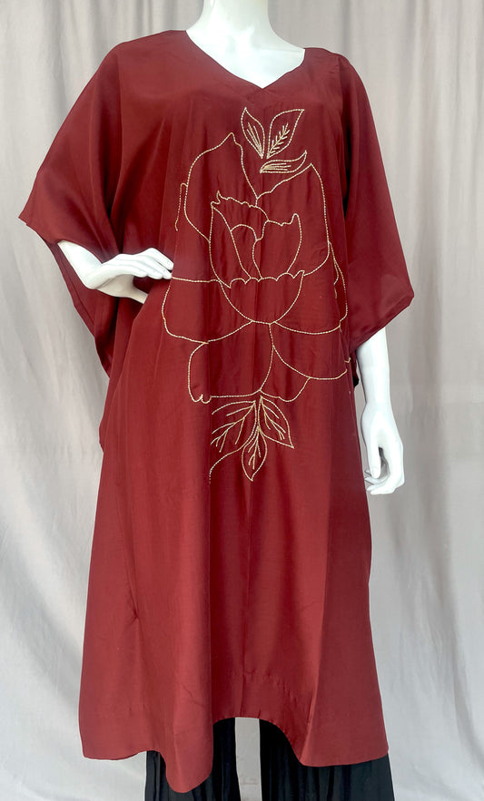 Maroon Hand Embroidered Kaftan, Pure Muslin Partywear Embroidered Floral Design Kaftan