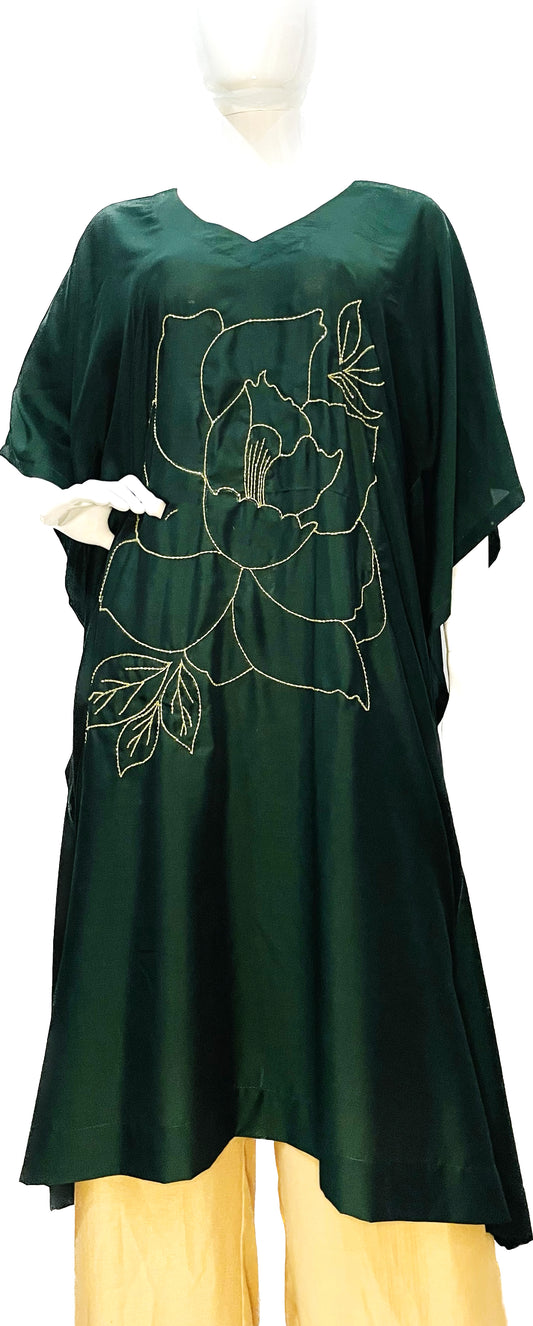 Emerald Green Hand Embroidered Kaftan, Pure Muslin Partywear Floral Design Kaftan