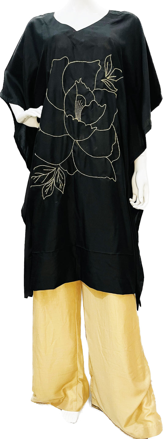 Black Hand Embroidered Kaftan, Pure Muslin Partywear Floral Design Kaftan