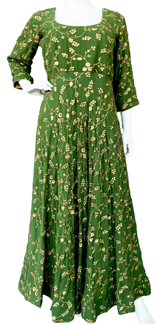 Olive Green Flared Pure Georgette Long Gown with Dupatta, Indian Long Dress, Golden Embroidery, Bridesmaid, Mehendi, Haldi, Wedding Wear