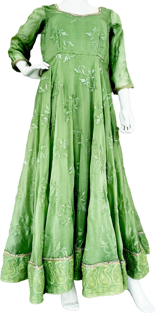 Pista Green Anarkali Gown with Stole, Pure Organza Embroidered Long Dress, Partwear, Plus size long gown with Dupatta, Indian Long Dress