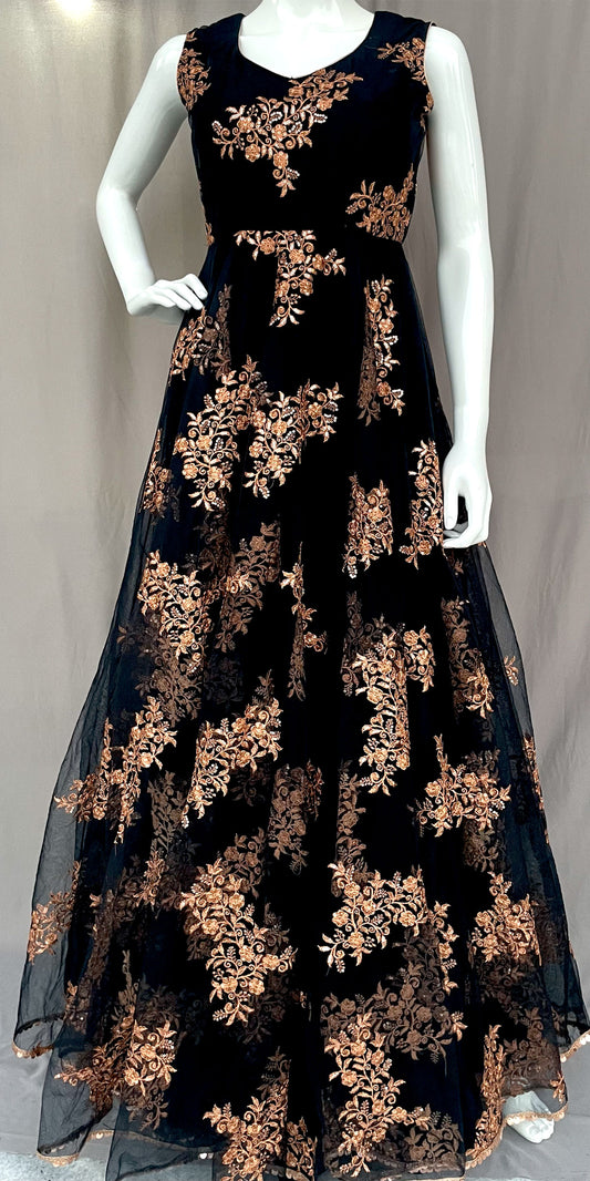 Pure Silk Long Black Brown Dress, Partywear Floor Length Dress with Net Dupatta