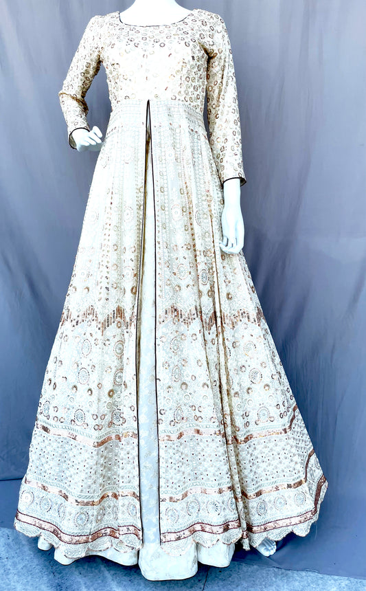 Off White Flared Pure Georgette Long Gown with Dupatta, Pure Chanderi Silk Indian Long Dress, Embroidered, Bridal Wear, Wedding Wear