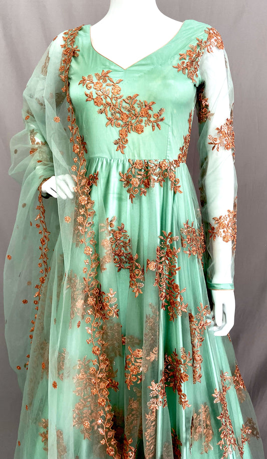 Green Flared Net Long Gown with Dupatta, Indian Long Dress, Embroidery, Bridesmaid, Mehendi, Haldi, Wedding Wear