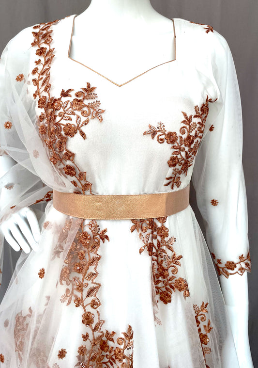 White Flared Net Long Gown with Dupatta, Indian Long Dress, Embroidery, Bridesmaid, Wedding Wear