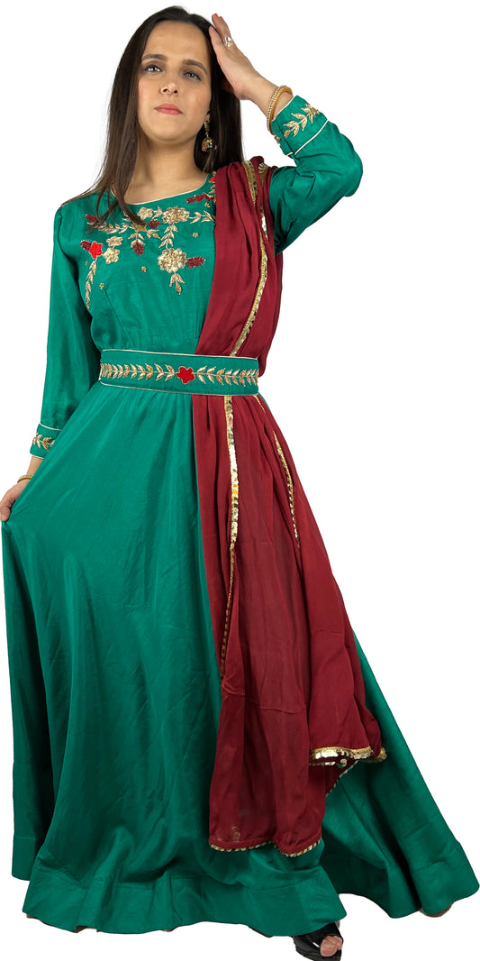 Green color hand embroidered long dress with belt and Maroon dupatta