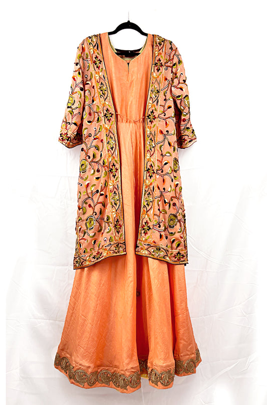 Long Peach Dress Silk Dress, Partywear Floor Length Dress with Velvet Stole