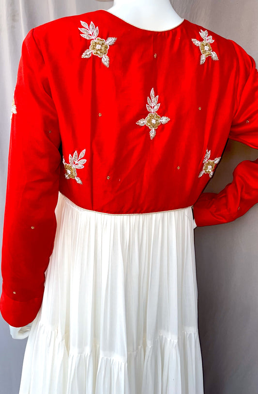 Red Hand Embroidered Jacket with White Flared Four Tiered Pure Muslin Long Dress