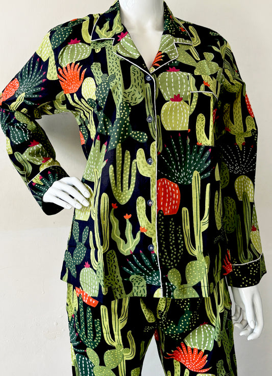 Black 100% Pure Cotton Cambric Women's Pajamas with Cactus Print