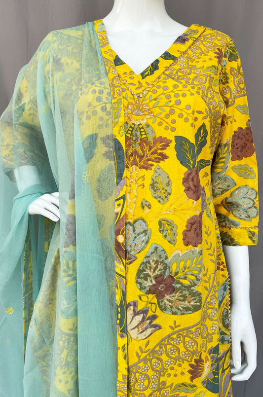 Yellow and Cyan Pure Cotton Indian Straight Pant Suit