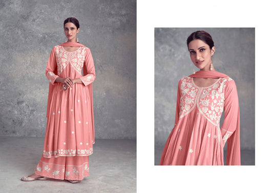 Peach Nyra Cut Palazzo Suit, Lukhnawi embroidery Palazzo Suit, Indian Ethnic wear