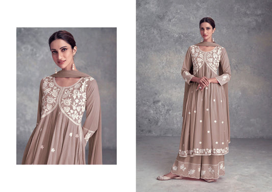 Pastel Brown Purple Nyra Cut Palazzo Suit, Lukhnawi embroidery Palazzo Suit, Indian Ethnic wear