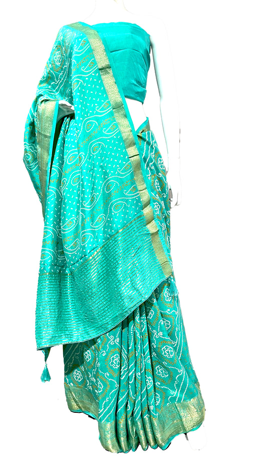 Sea Green Bandhani Sari, Bhandej Silk Saree, Jaipuri print Saree
