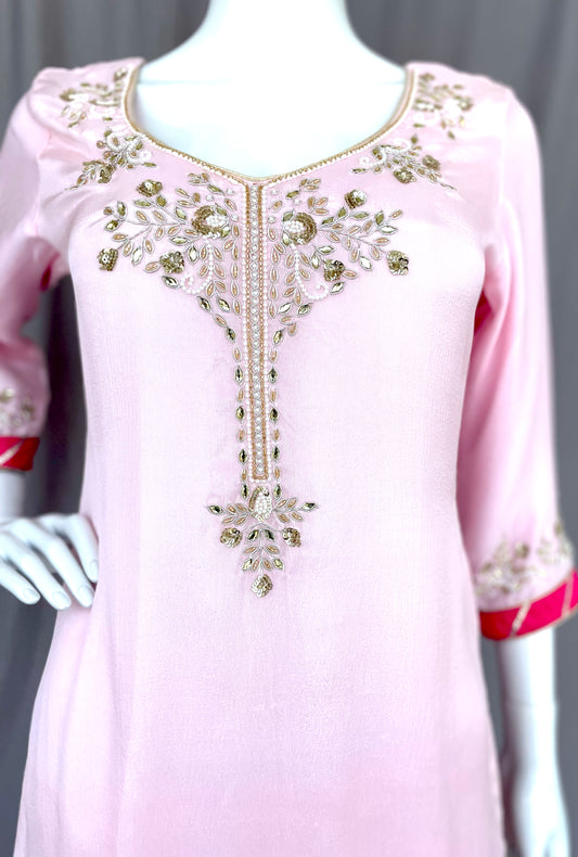 Blush Pink Pure Chinon Gharara Palazzo Suit, Hand Embroidered Suit, Dabka, Pearl Work