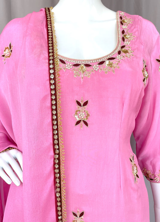 Onion Pink Pure Crepe Gharara Palazzo Suit, Hand Embroidered Suit