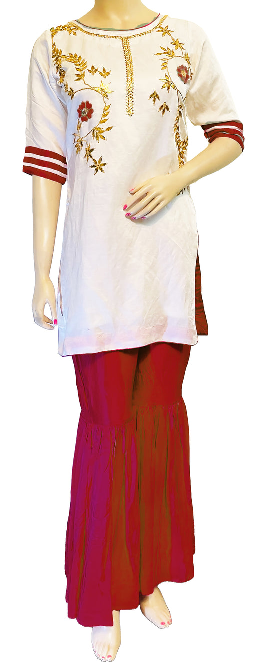 White & Red Color Hand embroidered Kurti & Gharara Palazzo Pant with Dupatta set