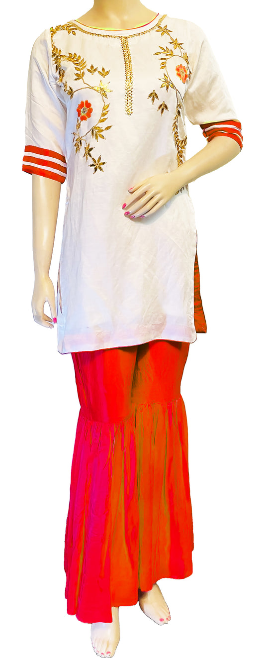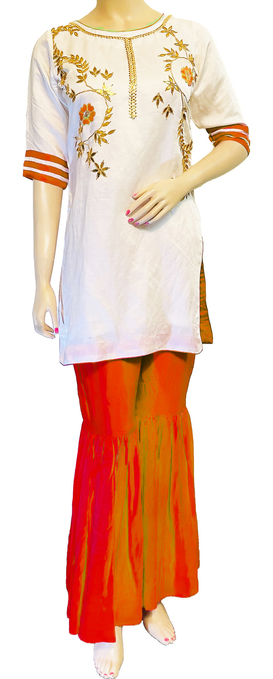 White & Orange Color Hand embroidered Kurti & Gharara Palazzo Pant with Dupatta set
