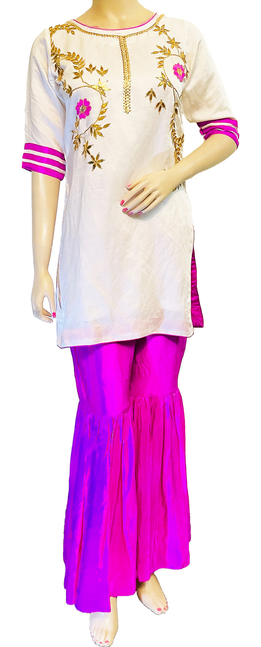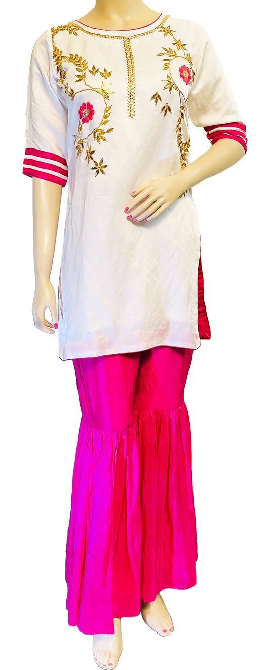 White & Hot Pink Color Hand embroidered Kurti & Gharara Palazzo Pant with Dupatta set