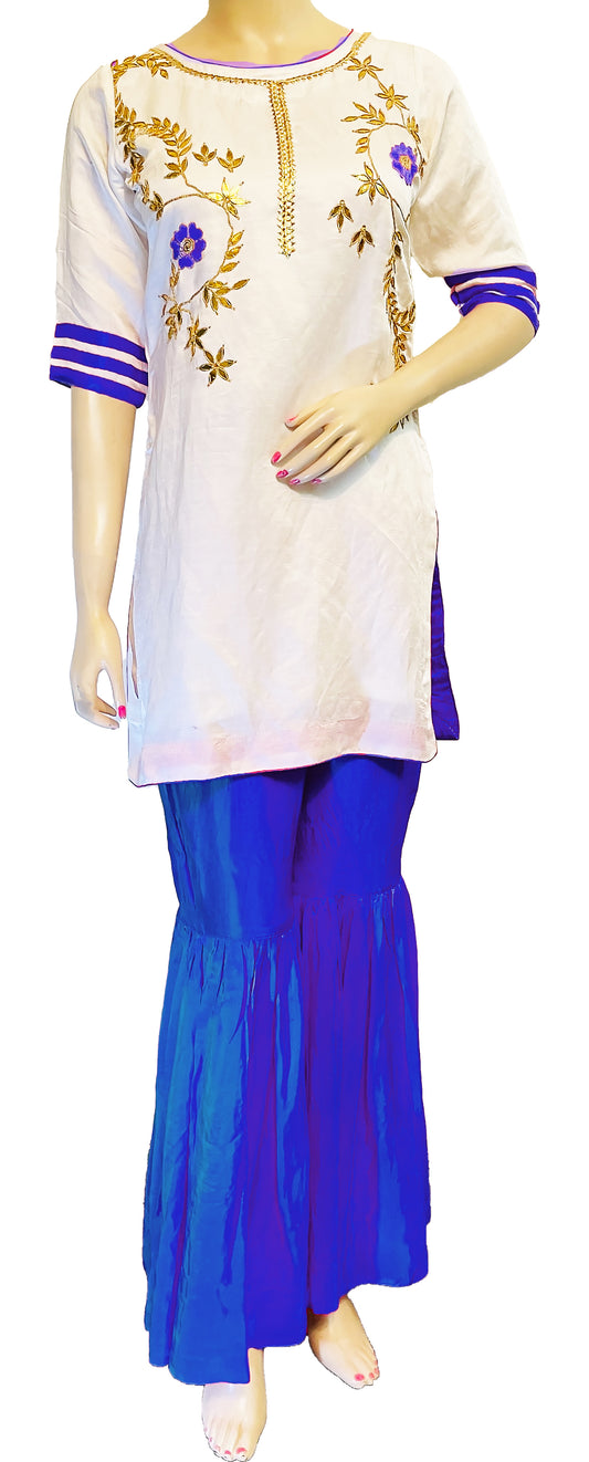 White & Blue Color Hand embroidered Kurti & Gharara Palazzo Pant with Dupatta set
