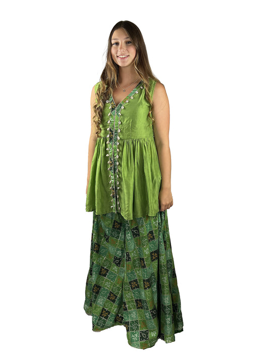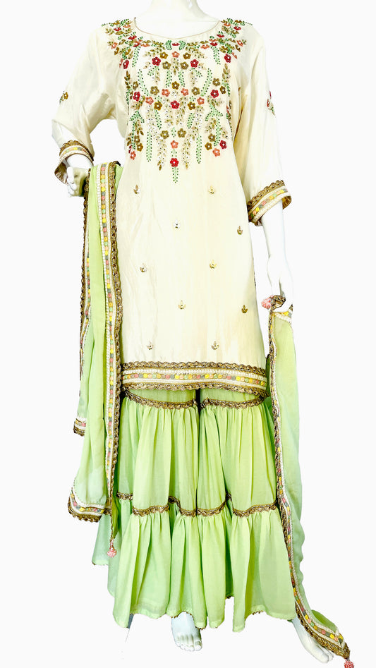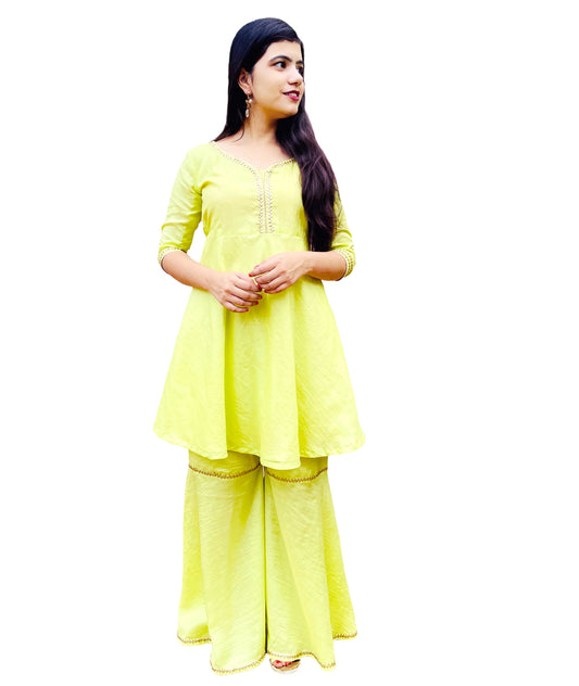 Light yellow green color Silk Gharara Dress with Embroidered Net Dupatta