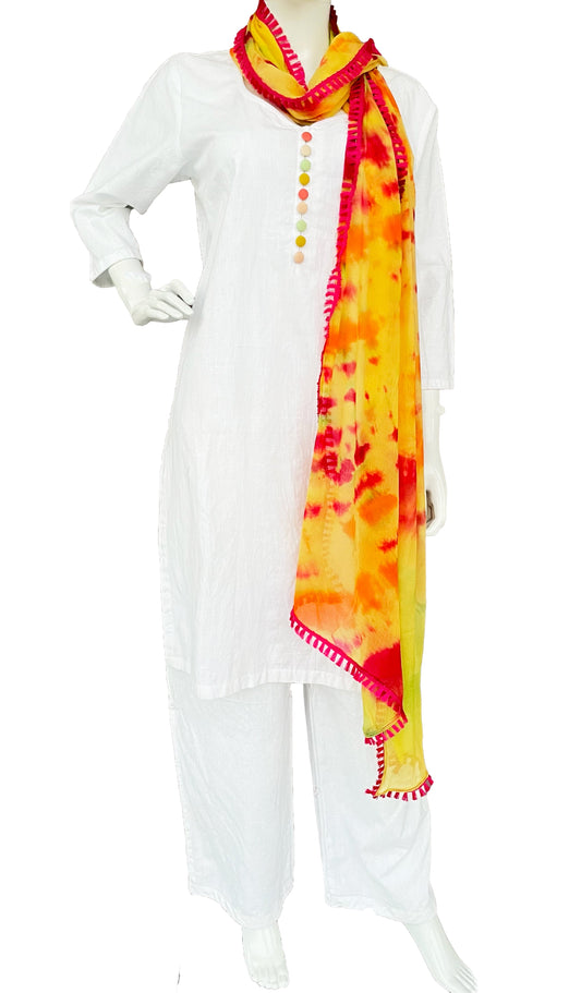 White Pure Muslin kurta Sharara With Yellow Red Tie Dye Dupatta