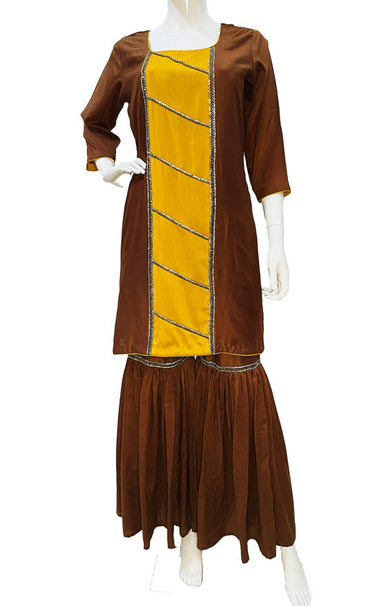 Brown Yellow Gharara Pure Muslin Suit With Tie Dye Dupatta with Border