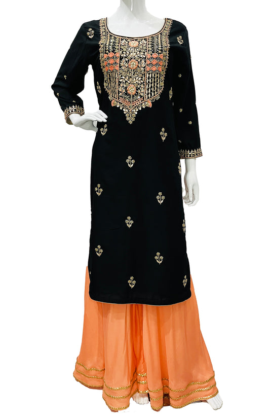 Peach Black Sharara Palazzo Suit with Zardosi Handwork Embroidery