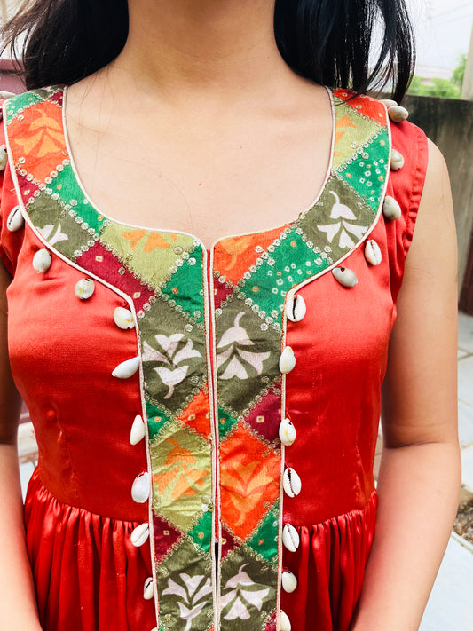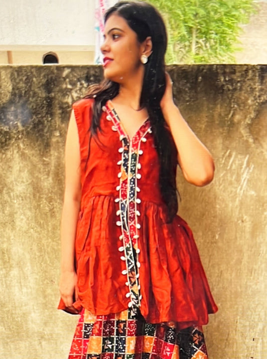Embroidered Rust Red Kurta Long Skirt with Long Kurti Set