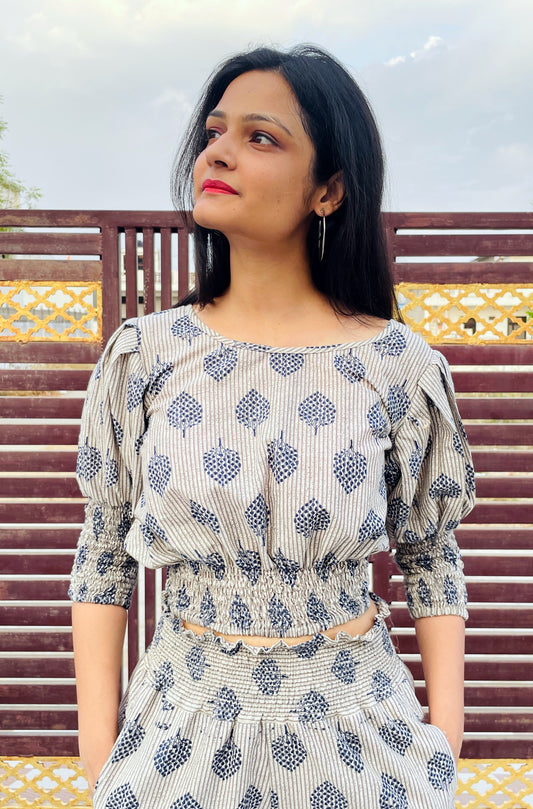Crop Top Bell Bottom Set, Summer Cotton Block Printed Grey Navy CO-ORD Set
