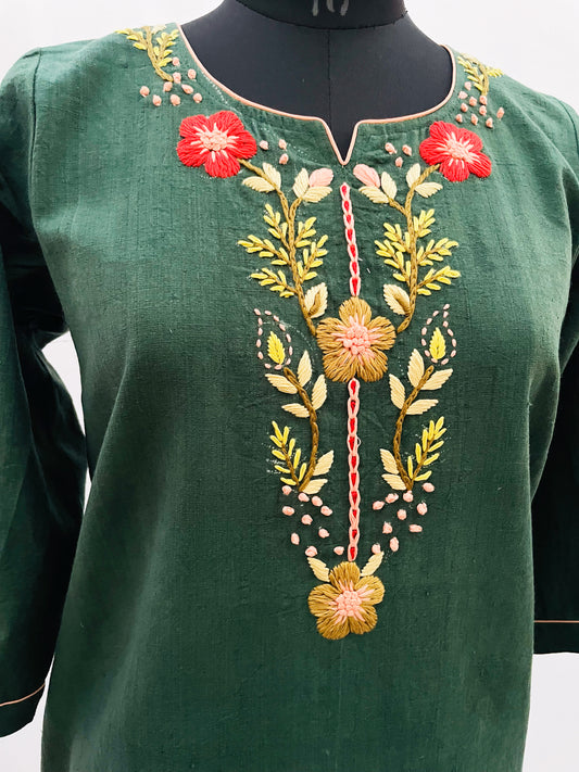 Mehndi Green Pure Khadi Cotton Kurta Hand Embroidered Tunic Top