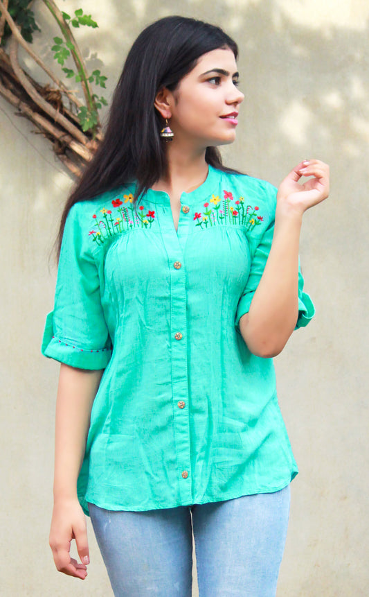 Button Up Top Sea Green Hand Embroidery Full Roll Up Sleeves Rayon Slub Shirt