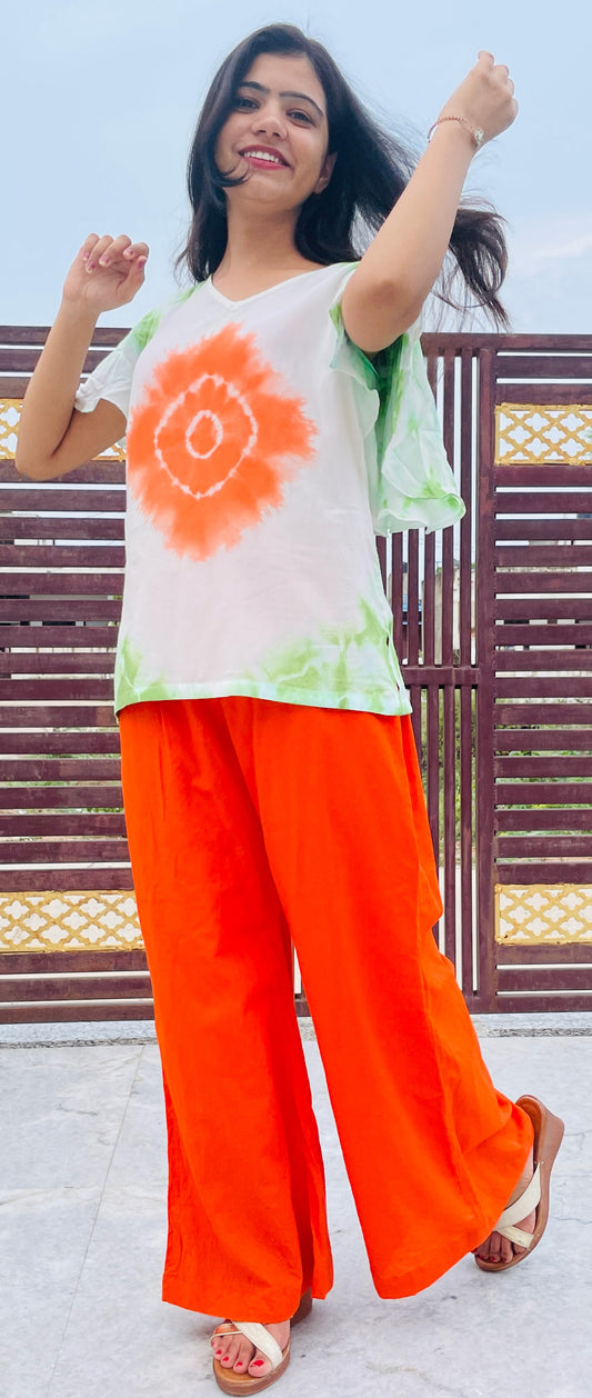 Hand Tie Dye Rayon Top, Orange Green White Color Butterfly Sleeves Top