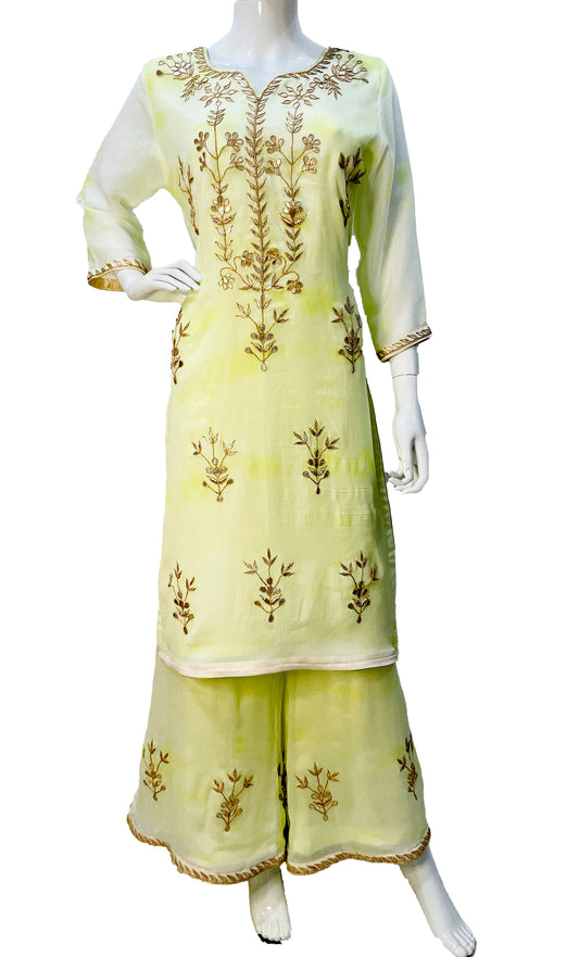 Yellow & Green color Hand Tie n Dye Georgette Fabric with Traditional Gota Patti Hand Work Long Kurti Palazzo Pants with Dupatta
