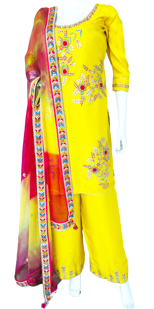 Lemon Yellow Pure Upada Silk Palazzo Suit with beautiful Handwork Embroidery