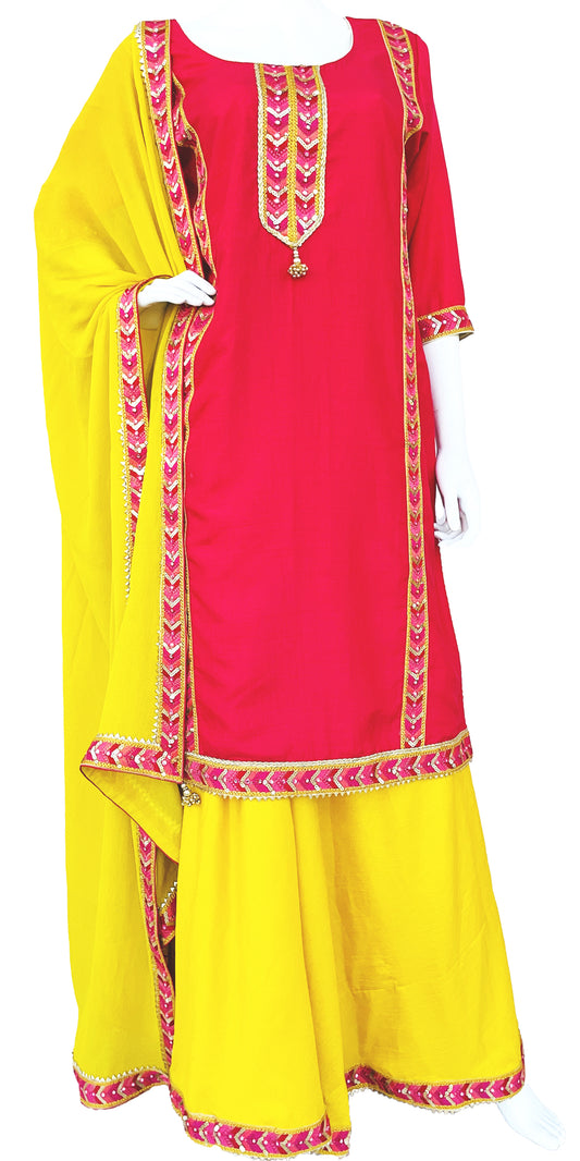 Yellow and Pink Silk Palazzo suit with fancy lace work