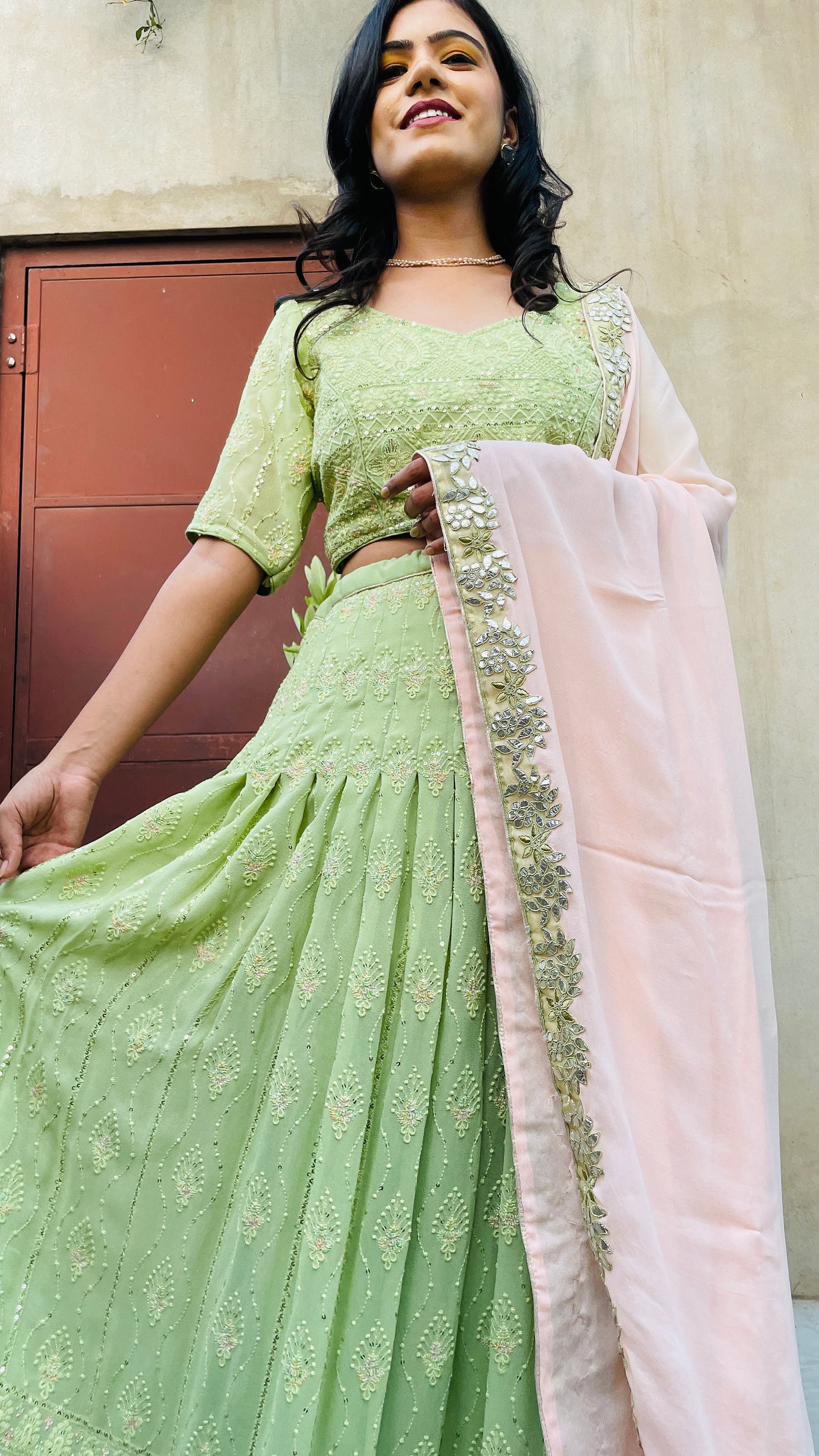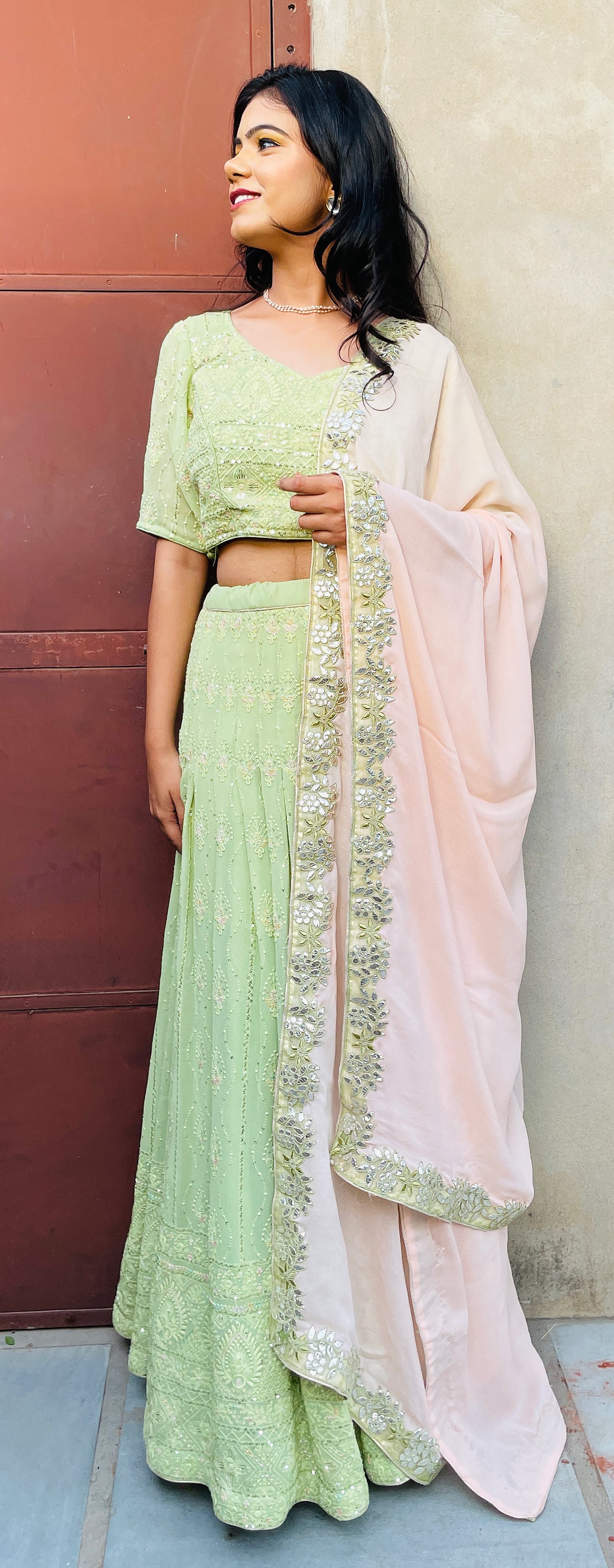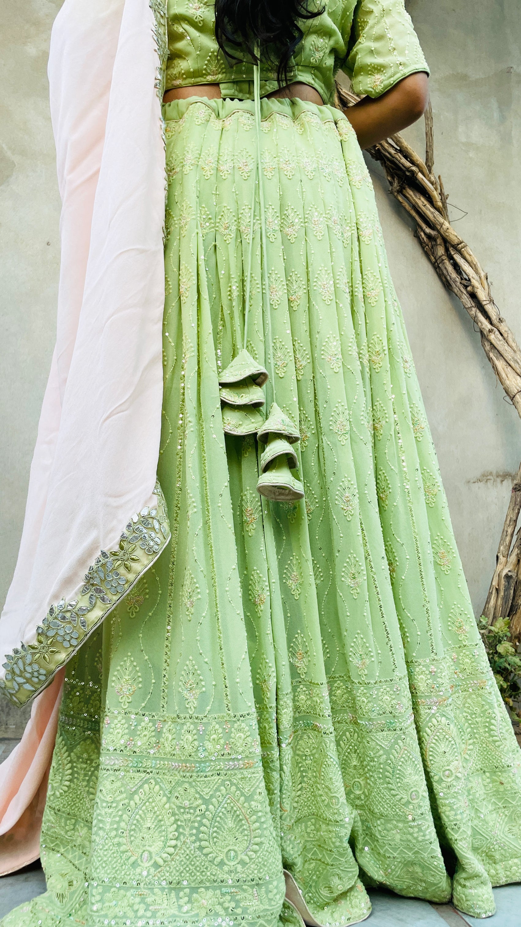 Pista Green , Pastel Shades embroidered Lehenga, Choli with blush Pink Dupatta (With Borders).
