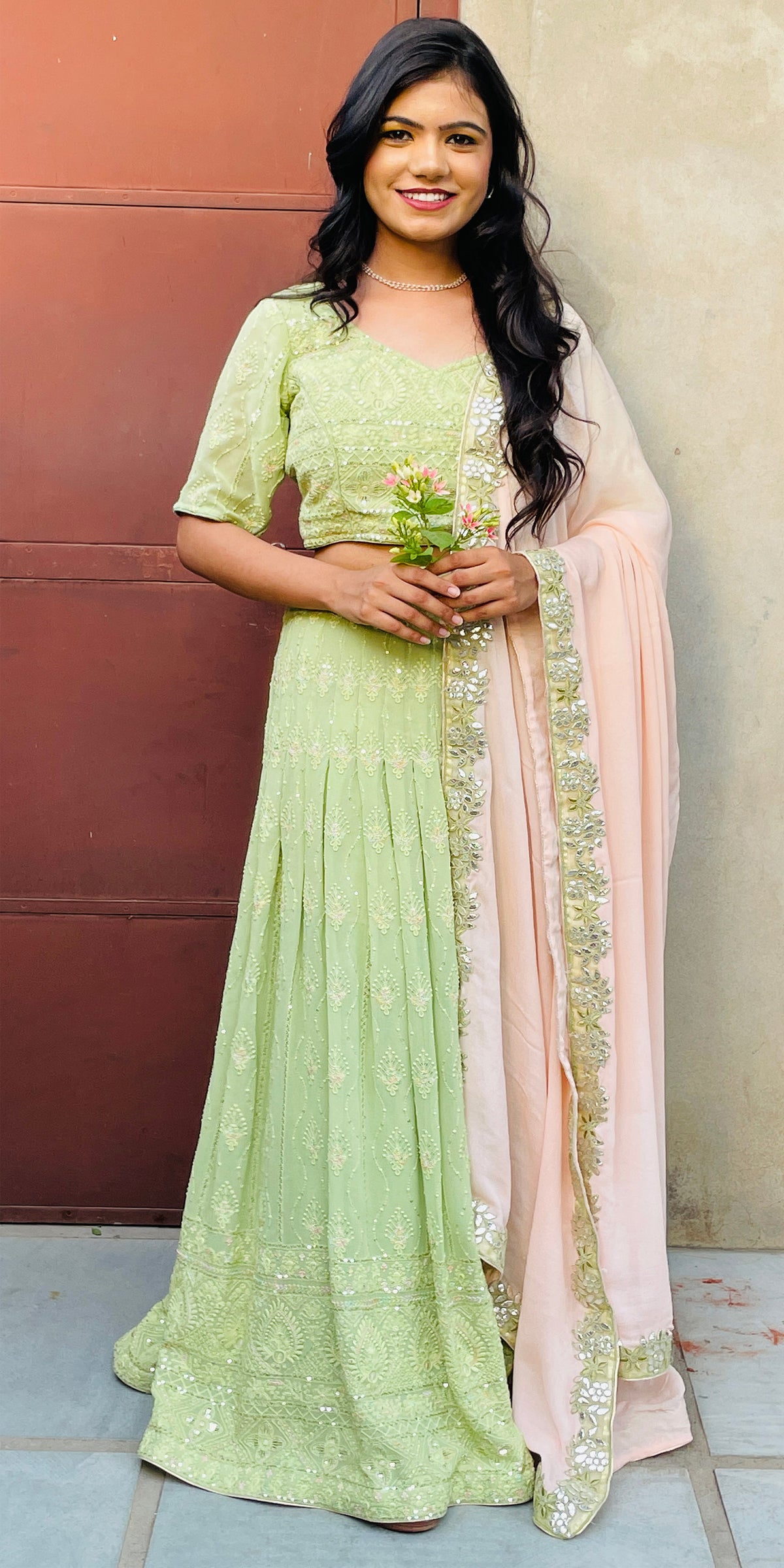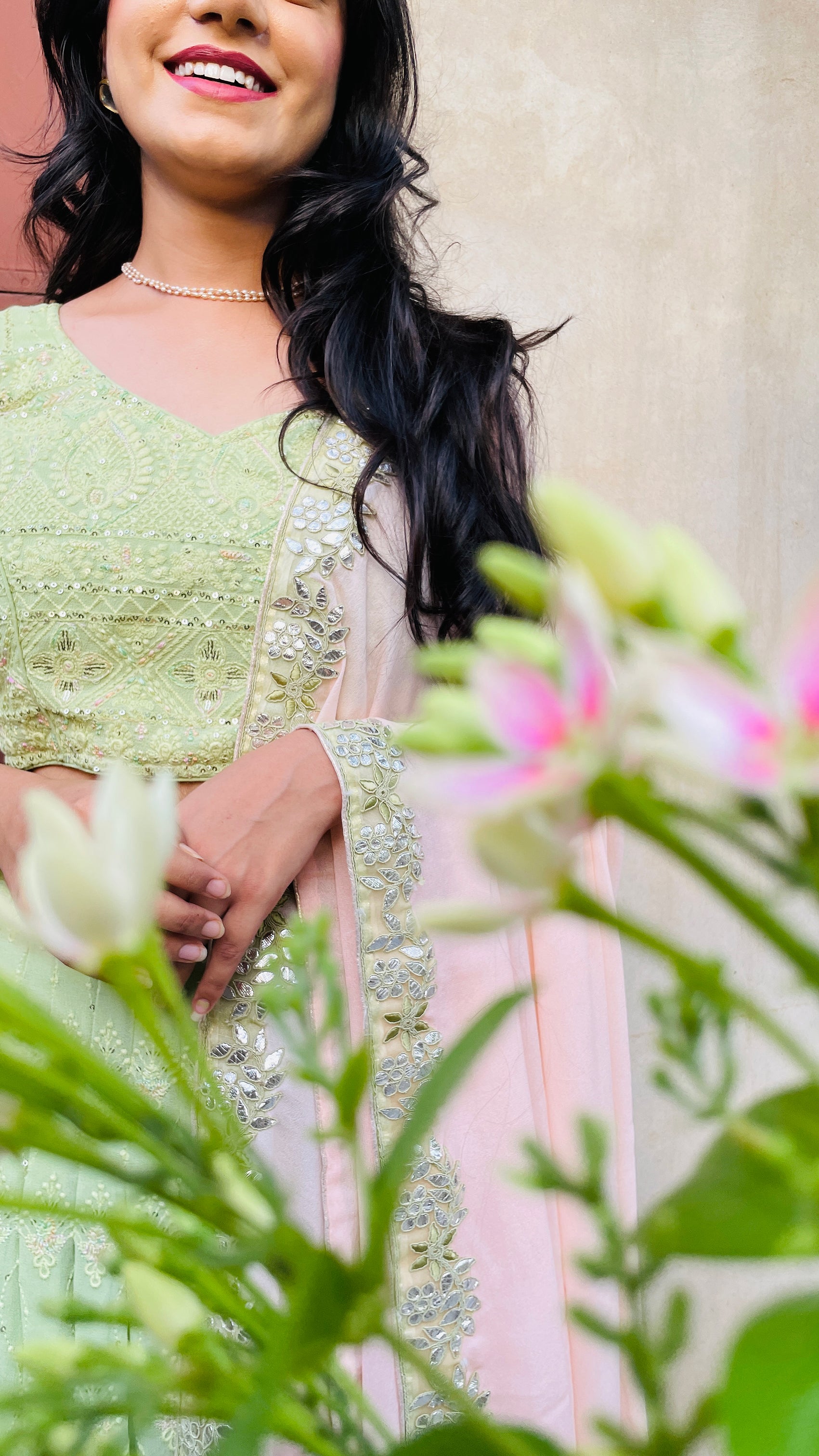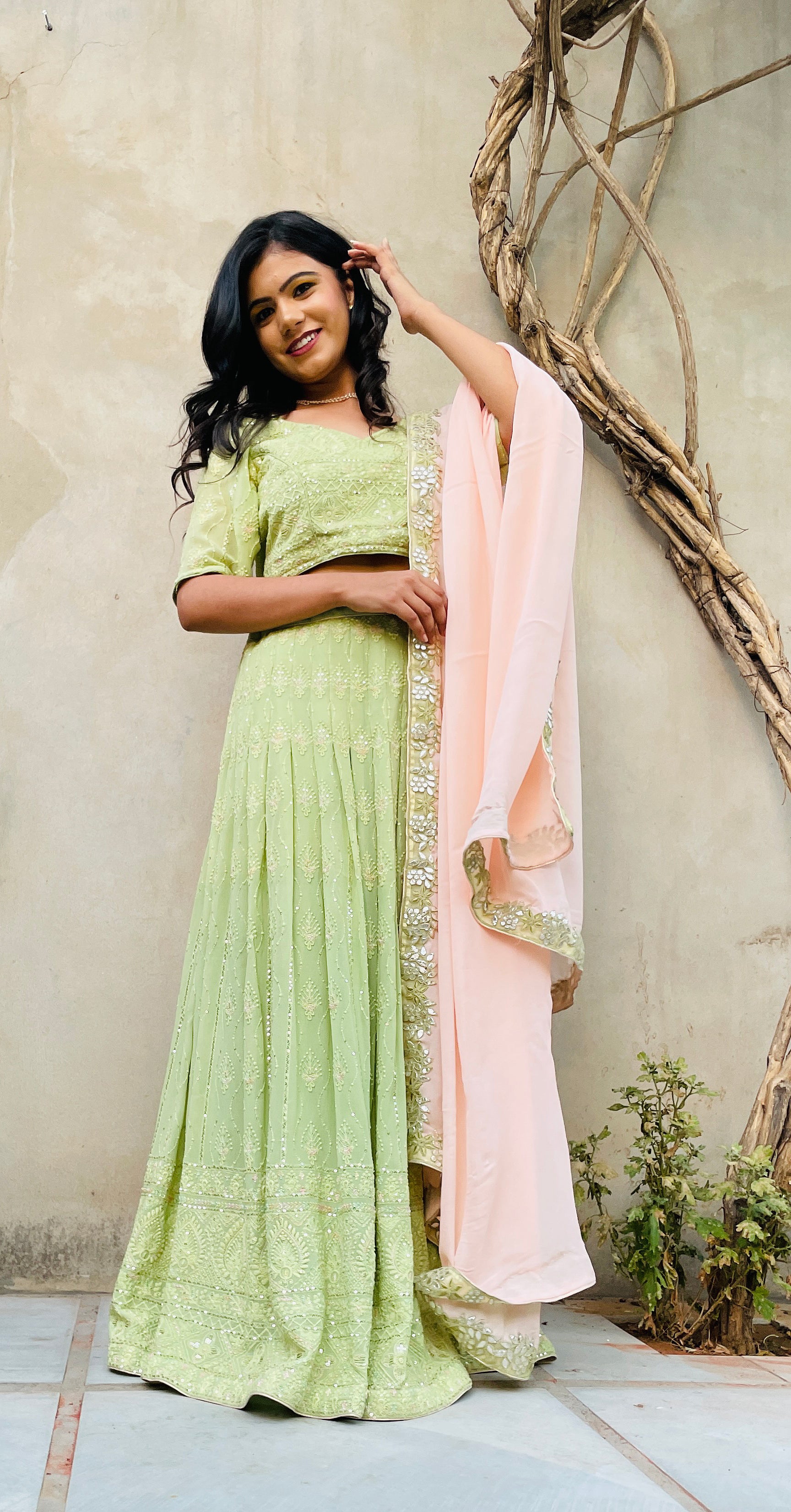 Pista Green , Pastel Shades embroidered Lehenga, Choli with blush Pink Dupatta (With Borders).
